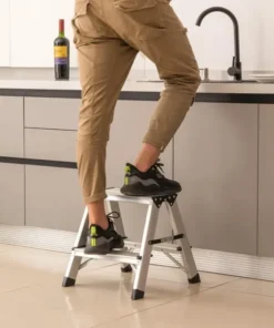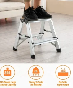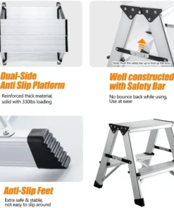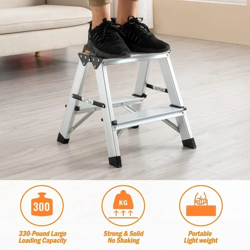 - 【Security & Stability 】- The metal step stool is made of high quality thick aluminum alloy material, strong and soild with four anti-slip feets and anti-slip lines are added to the step platforms to ensure non-slipy. To reinforce the stability, anti-movement safty lock bars are added both size of the stool to make sure it stay in place no bounce back while using – extra security to make you use at ease. The triangular structure is stable and with strong loading capacity of 330 Pounds/150KG, aluminum metal 2 step ladder is a quality stool that can last for years.